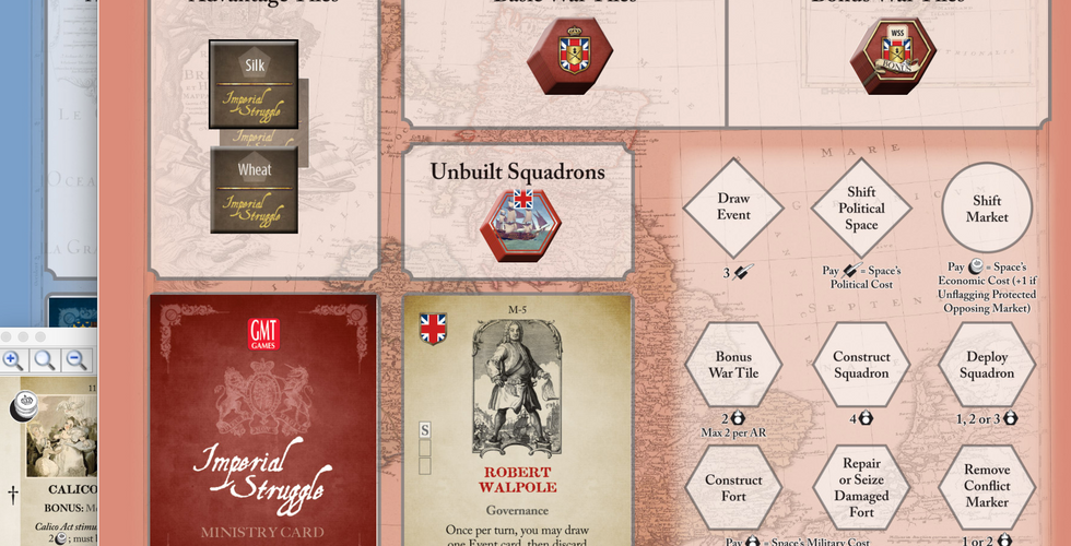The game consists of "Peace" turns peppered with "War" turns. During the Peace turns you go about typical Imperial tasks like taking over markets, building forts moving your navy and meddling in other countries affairs with diplomatic actions. Those actions are reinforced by Cards from your ministry deck, and event cards. Sometimes when you take over the diplomatic spots you get an advantage that you can use once per peace turn. I lost a lot of those and that also was part of my downfall.