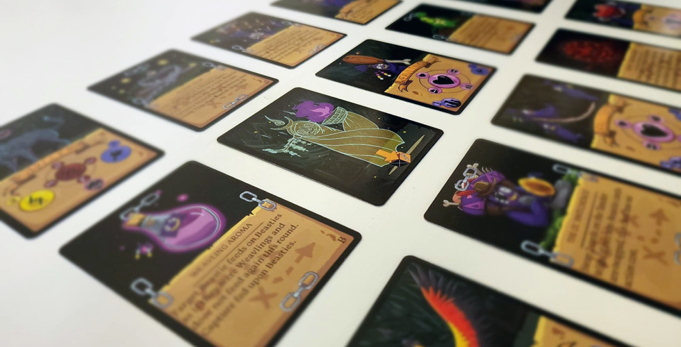 Weavlings in the Wilds is a card game that consists of 6 types of cards that will be laid out on the table in a 4x3 grid. There is a Trapper card this is the card you will move around the grid to take all of your actions like move, collecting traps, and using traps. There are the Trap cards that you will be using to manipulate the play grid. There are event cards that trigger an immediate effect. There are Weavling cards and these are your route to wining the game. You will lure them by paying their meat cost and adding the card to your population. Get 10 population and you win. The Beastie cards are the cards that are going both help and prevent you from getting a win. Beasties are your source of meat and also will eat the Weavlings if they are near by. Finally there are the Wild Spirit Cards, these cards will offer you a boon during the game and are played with a free action.