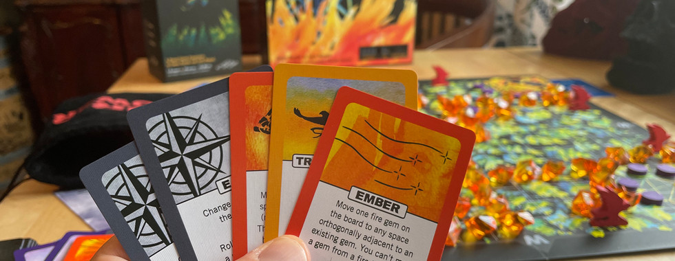 The components in this game are 🔥. Well specifically the 135 fire gems that come in a nice cloth bag. The base game comes with those gems the cards to play a 2-4 player game, and a bunch of other nice components like the wooden firebreak tokens and the marbled wind direction D8.