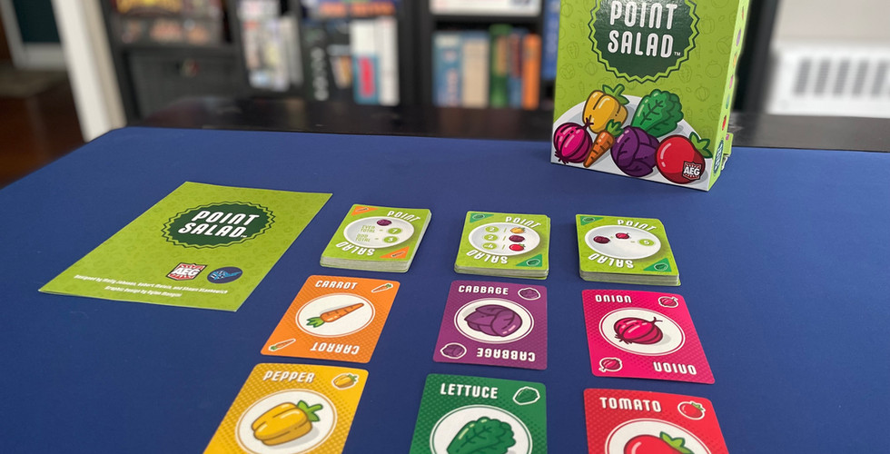 Point Salad is a great casual game that is easy to bring on a family road trip, just on a weekday evening or at game night when you are waiting for the last couple of people to get there, you know who you are... we start at 8 not 8:30. I really enjoyed playing this and my wife Mary and she really enjoyed winning Point Salad. This game is widely available at your friendly local game stores or at online retailers if you dont have a FLGS near you. Enjoy your veggies with Point Salad.
