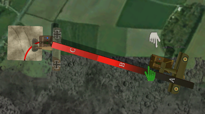 When you are close enough to the other planes you can take shots at them. Most all of the planes have a 45 degree forward firing arc. You can use the supplied measuring apparatus to see what range you are in. This turned out to be a little tricky in Tabletop Simulator. I kept thinking i was in range when I wasn't. Helpuful hint: move directly over both ends of the stick not just one. Measure from the post of your mini to any part of the base of another mini. There are three ranges A, B and C. the closer you are the more damage cards you draw. When the plan runs out of hit points its destroyed.